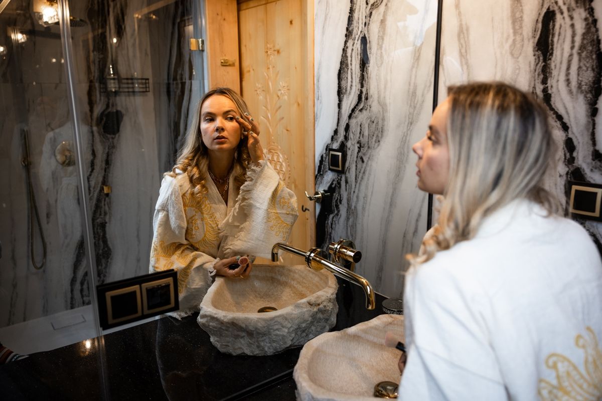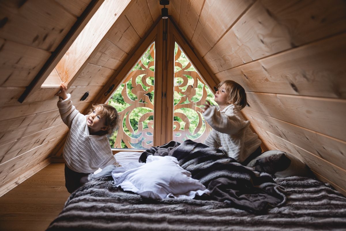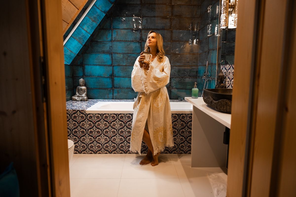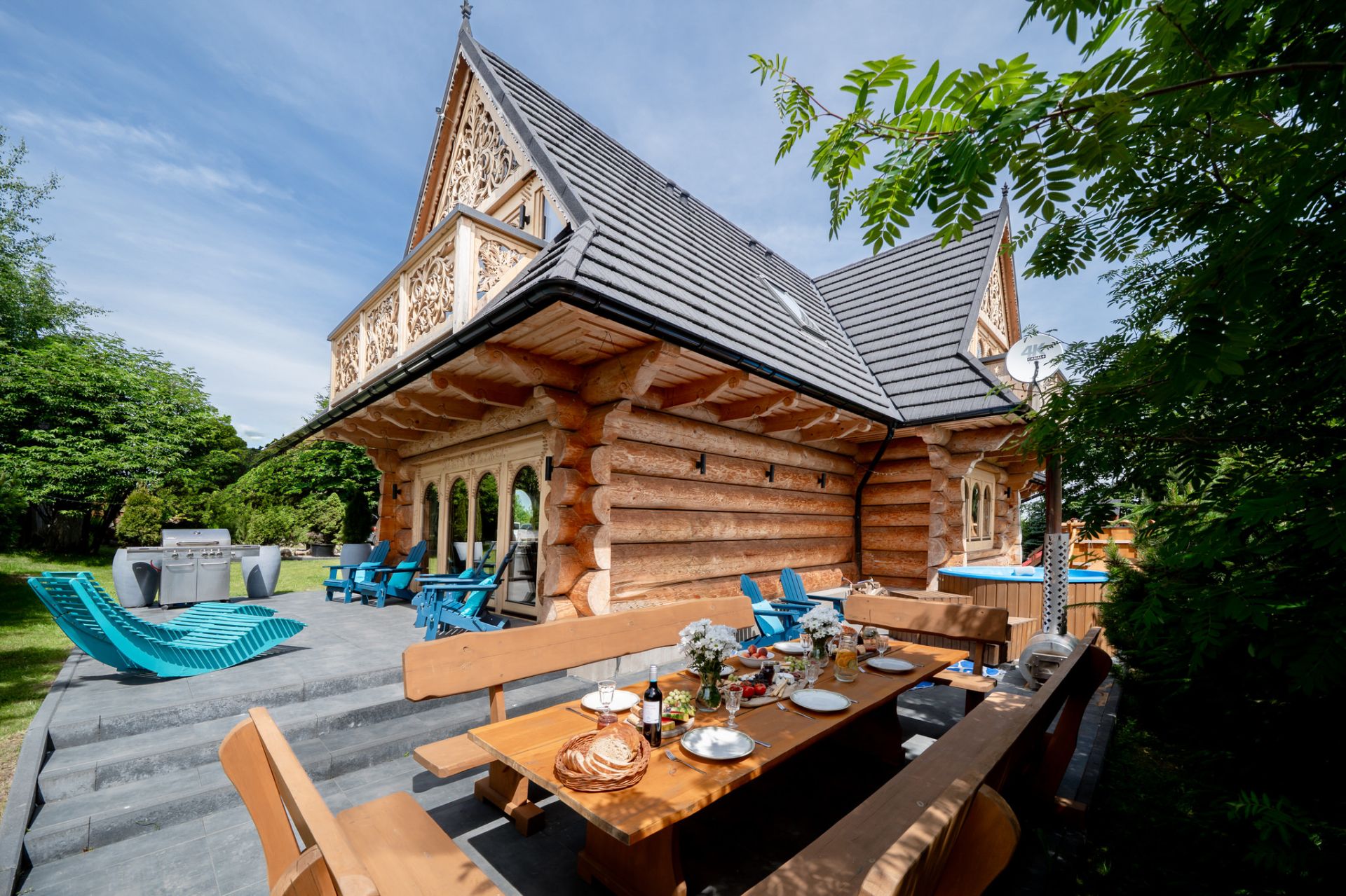 Bajkowa Lux pomieści do max 20 osób i oferuje cztery komfortowe sypialnie z prywatnymi łazienkami, antresolę dla 4 dzieci, przestronny salon o powierzchni 70 m² oraz taras o powierzchni 60 m² z prywatną balią z jacuzzi, dużym grillem gazowym, stołem biesiadnym, fotelami i leżakami.